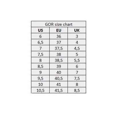 EU 36 US 6.0 UK 3.0 | 23.5 cm EU 37 US 6.5 UK 4.0 | 24.5 cm EU 38 US 7.5 UK 5.0 | 25.0 cm EU 39 US 8.5 UK 6.0 | 25.5 cm EU 40 US 9.0 UK 7.0 | 26.0 cm EU 41 US 10 UK 8.0 | 26.5 cm